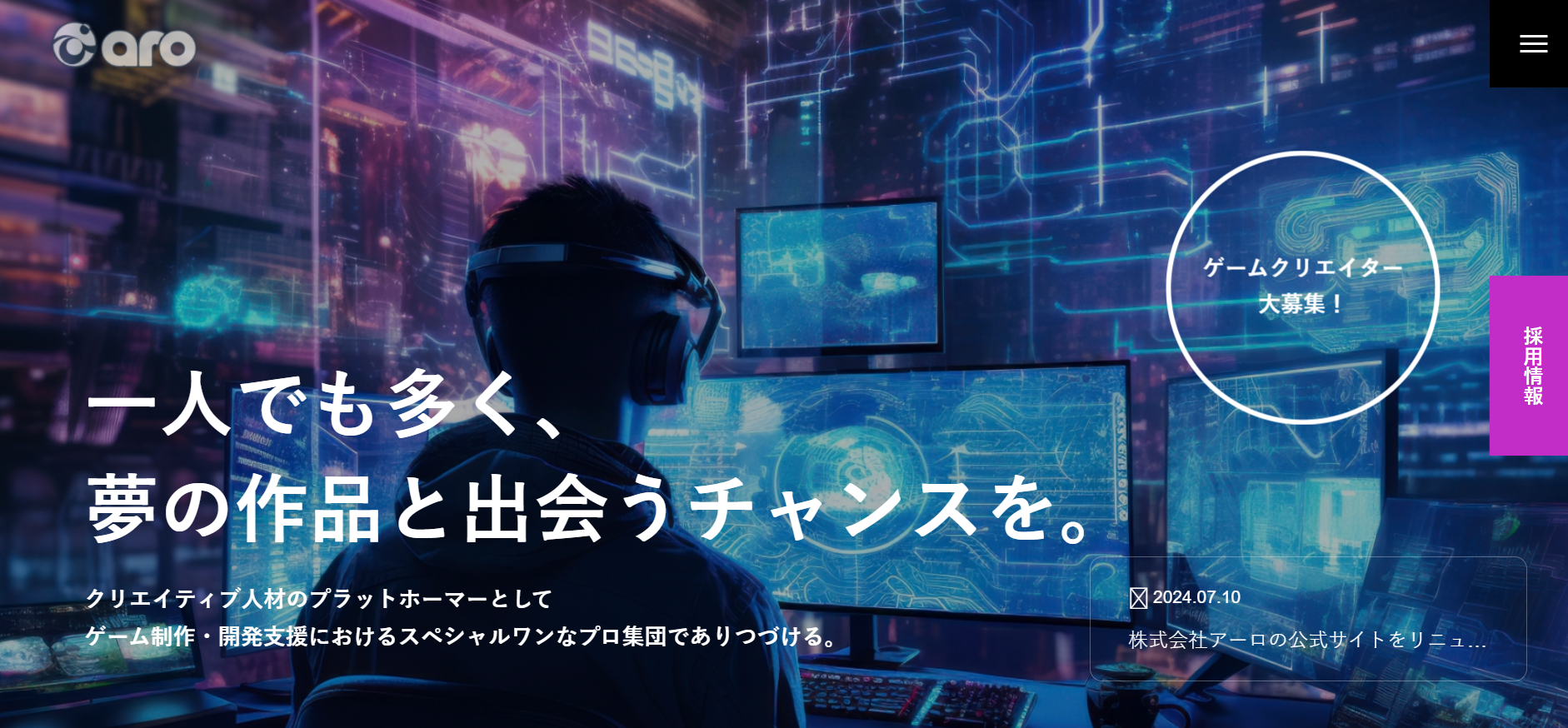 株式会社アーロに対し、採用力とブランド力の向上を目的にコーポレートサイトのリニューアルを実施しました。提案段階で高い評価をいただき、初回打ち合わせの場で即決受注につながりました。制作ではテンプレートを活用しつつも独自性を重視し、ゲーム業界らしい革新性と採用活動に必要な温かみを両立。迫力あるメインビジュアルや、働く環境の魅力を伝える採用ページを短期間で公開し、社内外から高い評価を獲得しました。