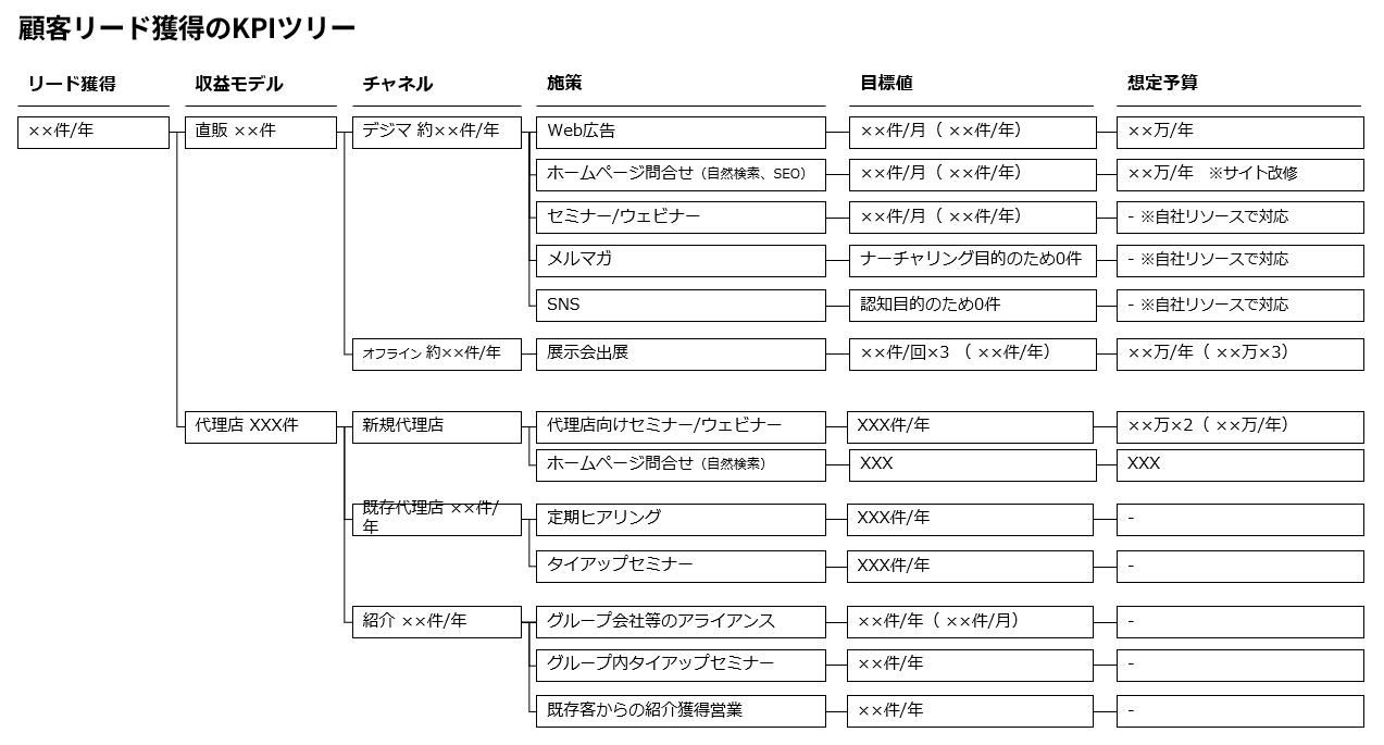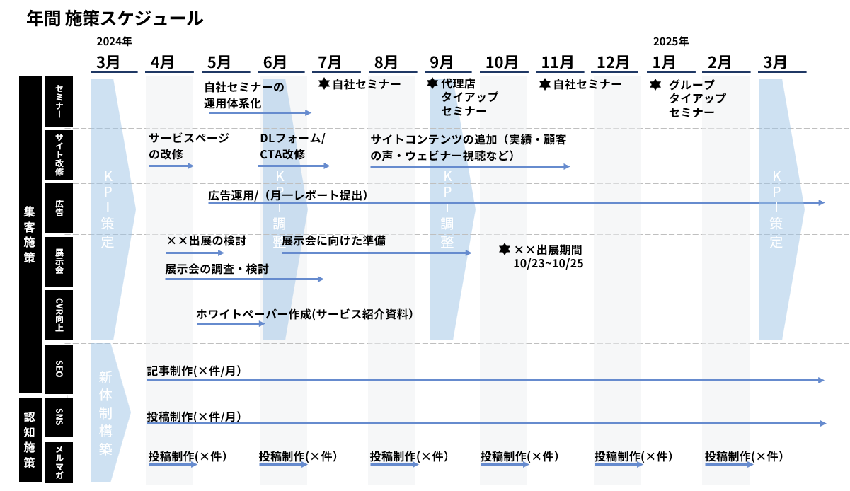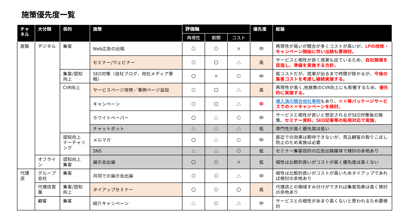 KGI(受注数)から逆算し、リード獲得数などのKPIを立案し、短期的・中長期的に何をやるべきか施策立案と優先順位を策定しました。