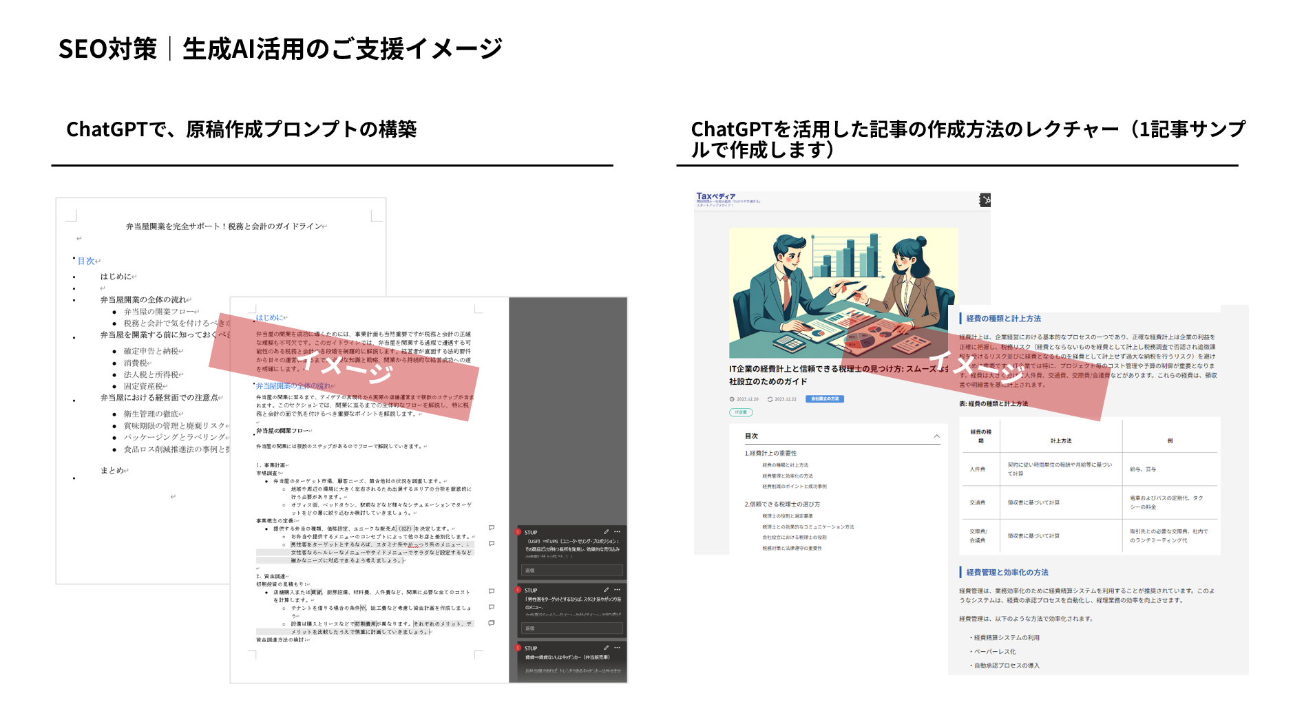 キーワード設計などのマーケティング知識がないと行えない内容は弊社側で実施。業界専門的な知識が必要な記事執筆についてはAIを用いた記事執筆方法をレクチャーさせて頂き、ご担当者様にて記事制作を進めウェブサイトへの集客数増加に貢献しました。