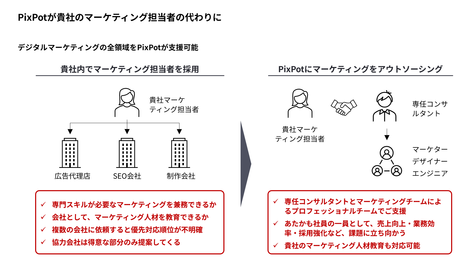 自社でのマーケティング人材が不足している・スキル不足などのお困りの企業様、それぞれの企業様にに対してカスタマイズしたご支援をさせて頂きます。お気軽にお問合せください。